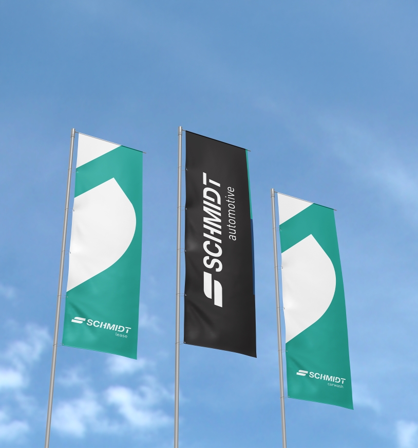 De doorvertaling van de nieuwe identiteit zie je terug op alle huisstijldragers. Zo is bijvoorbeeld ook het hele pand compleet voorzien van nieuwe signage en is het wagenpark van Schmidt voorzien van nieuwe belettering. Zelfs de occasions zijn subtiel voorzien van nieuwe kentekenplaathouders waar het logo zichtbaar op is.